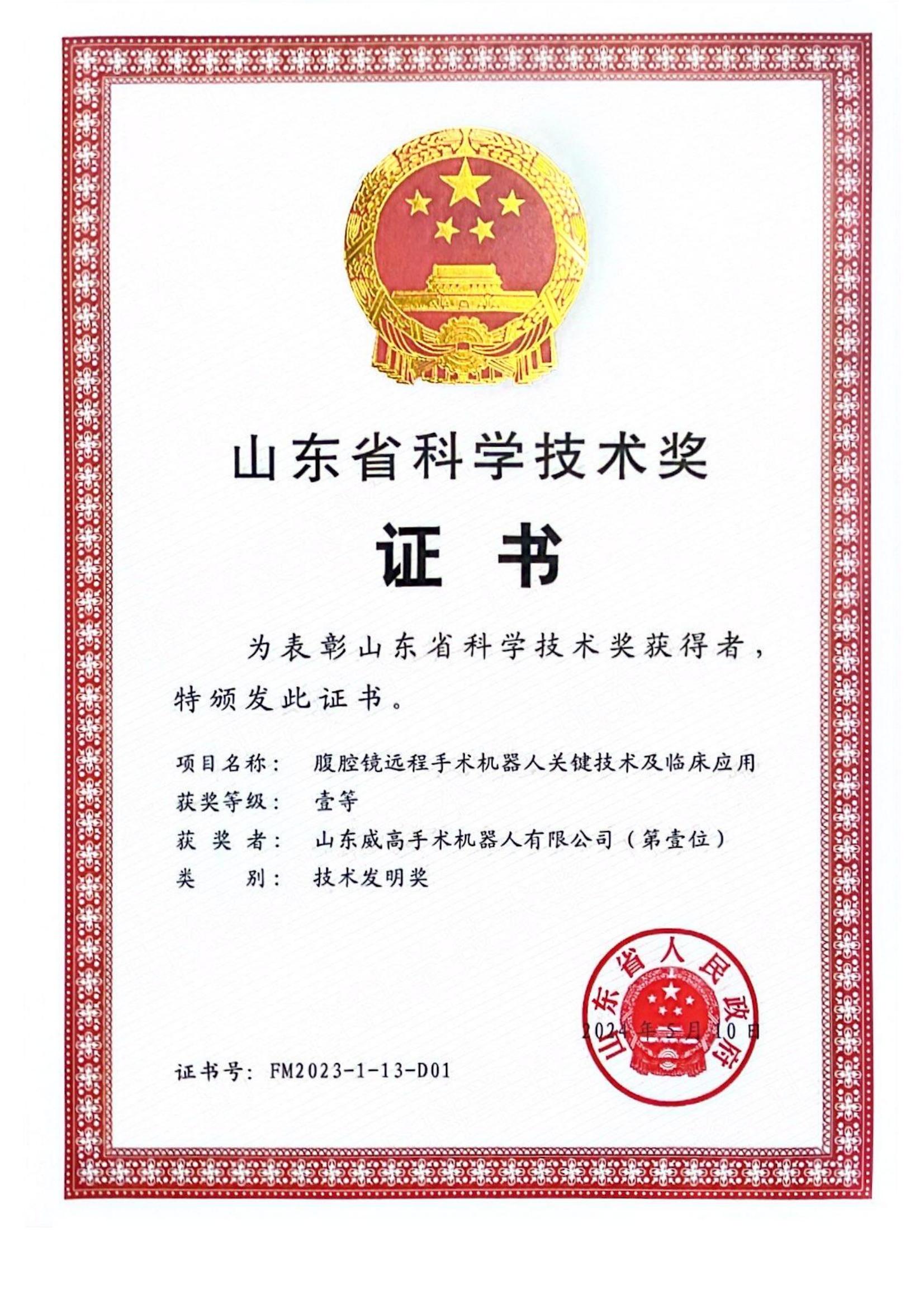 5月13日,山東省人民政府網(wǎng)站發(fā)布《山東省人民政府關(guān)于2023年度山東省科學(xué)技術(shù)獎(jiǎng)勵(lì)的決定》,經(jīng)省科學(xué)技術(shù)獎(jiǎng)勵(lì)評審委員會(huì)評審、省科學(xué)技術(shù)獎(jiǎng)勵(lì)委員會(huì)審定和省科技廳審核,授予由山東威高手術(shù)機(jī)器人有限公司作為第一完成單位參與的“腹腔鏡遠(yuǎn)程手術(shù)機(jī)器人關(guān)鍵技術(shù)及臨床應(yīng)用”成果為省技術(shù)發(fā)明獎(jiǎng)一等獎(jiǎng),這也是威海市唯一的一等獎(jiǎng)企業(yè)。